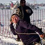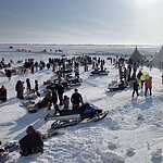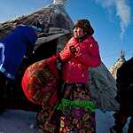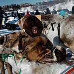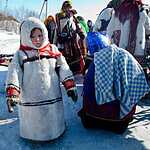 Благодаря тому, что снегоходная гонка идет порядка 2-х часов, мы могли побродить вокруг стартового городка. А тут было на что посмотреть. Тут и национальная борьба, и перетягивание палки, и метание тынзяна на хорей. А финалом праздника была гонка на оленьих упряжках. Никогда не думал, что упряжка из четырех оленей может поворачивать на 180 градусов практически на месте, как машина с зажатым ручником. Мы давно хотели попасть на праздник оленевода. И вот мечта сбылась! Какая атмосфера! Люди в национальных костюмах Чумы, олени, нарты. Рядом жители тундры продают замороженного муксуна и щекура, оленину. По-соседству лежат тушки зайцев и куропаток. На соседних развалах продают национальную одежду и обувь.