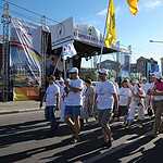Дальше шли представители эпохи ударной стройки 30-х годов. В составе этой группы проехала Доменная печь №1, давшая первый чугун 80 лет назад – 7 ноября 1934 года. Кстати, именно эту дату связывают с днем рождения завода. Сейчас НЛМК вообще празднует 80-летие, и празднования обещают растянуть до конца года. Следом за доменной печкой прошли «пятидесятники», «шестидесятники» – иными словами ветераны производства. Их сопровождали молодые специалисты и Доменная Печь №7 «Россиянка», также водруженная на «Газель».