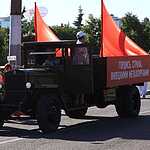 Самой большой группой шли представители важнейшего для региона предприятия – Новолипецкого Металлургического комбината, про который я уже писал ранее. Здесь было все: и люди, и плакаты, и лозунги, и даже доменные печи на «Газелях». В начале колонны ехал исторический автомобиль «ГАЗ М», украшенный растяжками «Гордись, страна, липецкими металлургами!».