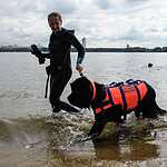 Чтобы вас спасти с берега, все чаще применяются специально обученные собаки-водолазы межрегиональной кинологической общественной организации “Сотер”. Здоровенные такие черные мохнатые друзья человека, способные вытянуть на берег до семи человек за раз или отбуксировать катер (есть у них такое упражнение) весом до тонны! Получая команду, такая собачка к вам подплывает и предлагает на выбор либо ухватить вас пастью если вы, например, без сознания и буксировать на берег, либо, если сознания вы лишиться не успели, то можете ухватиться за специальный жилет, в который одета каждая такая собака-спасатель.