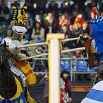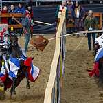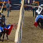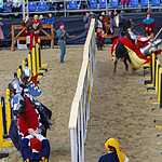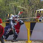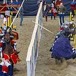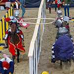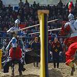 Во время конной сшибки два рыцаря с копьями наперевес устремляются навстречу друг другу каждый по своему коридору и, поравнявшись, соперники должны сломать своё копьё о щит противника или попытаться выбить его из седла. Удары были такими сильными, что у противника лопались подпруги, застежки, вылетали щиты. За сломанное копье участник получал один балл, если же ему удавалось выбить соперника из седла, то ему присуждалось 5 баллов и победа в поединке. Удар копьем можно наносить только в щит или в шлем, главное не задеть лошадь, для чего кстати и сделан барьер между соперниками. За удар в любую другую часть с участника снималось очко.