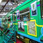 Это новый состав серии 81-760А со сквозным проходом через вагоны, каждый из которых снаружи окрашен в цвета основных линий метрополитена, на бортах размещены фотографии и даты значимых событий в жизни главного общественного транспорта столицы, а внутри разместился своеобразный музей. Яркий дизайн именного поезда обязательно понравится всем пассажирам, которые смогут узнать об истории станций и их архитекторах, об эволюции вагонного парка метро. Только в этом поезде станции объявляет голос народного артиста Советского Союза, диктора Центрального телевидения СССР и Первого канала Игоря Кириллова.