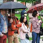 Практически все выступления воскресения проходили под дождь. Он то уменьшался, то лил, как из ведра. Но никто не ушел домой, наоборот, публики становилось все больше. Народ доставал зонты, яркие дождевики, некоторые прятались под деревьями.