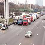 Хватаю камеру, пробегаю мимо кабинета начальства – «Я на часок отлучусь!» – бегу на МКАД. Три правых ряда заставлены грузовыми машинами, два левых свободны, по ним спокойно проезжают легковые машины и иногда различный спец. транспорт типа пожарной бригады, кареты «скорой помощи». Иногда кто-то из грузовых не выдерживал, выруливал в левый ряд и пытался проехать вместе с легковыми – но ему тут же махали полосатым жезлом и останавливали перед колонной. В итоге «группа в полосатых купальниках» растянулась еще метров на 200 – от съезда со МКАДа на Ленинградское шоссе до выезда с «Ленинградки» на МКАД.