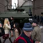 Хорошая погода, украшенный к фестивалю Московская весна город – чудный вечер. Почему бы не посмотреть на современную военную технику, вошедшую в город? От Маяковки до Манежной площади москвичи заняли все бордюры и парапеты, чтобы лучше разглядеть танки «Армата», бронеавтомобили «Тигр», зенитные ракетные комплексы. Участники репетиции, кстати, были одеты не только в современную военную форму, но и в форму времен Великой Отечественной.