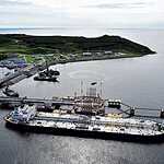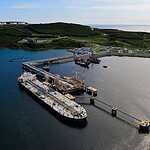 Вид на площадку береговых и причальных сооружений с двумя узлами учета нефти (СИКН) и выносным нефтепирсом для приема танкеров водоизмещением от 80 до 150 тыс. тонн.