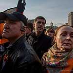 Политические партии, всякие НОДовцы, какие-то казачьи организации. Все в тряпках с символикой, с флагами. Хорошо, хотя бы в начале мероприятия со сцены попросили убрать все политические флаги. Иначе бы вообще все происходящее было бы похоже на обычный провластный митинг, только лозунги со сцены другие.