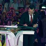 А вот самым торжественным моментом стал вынос книги «Тебе, моя губерния!». Это книга пожеланий астраханцев родному краю. По задумке организаторов, издание совершило своеобразное путешествие по всем районам области и любой желающий смог оставить в ней запись с пожеланиями и поздравления родной губернии. Свою запись оставил и губернатор Астраханской области Александр Жилкин.