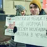 Люди проходили с плакатами против массовых похищений и пыток в Чечне, за освобождение политзаключенных, скандировали имена Александра Кольченко, Дмитрия Богатова.