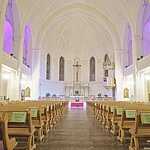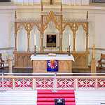 Интерьеры лютеранского собора выглядят аскетично в сравнении с пышным убранством православных храмов. Алтарь украшен витражами с изображениями святых: в левой части Мартин Лютер в традиционном облачении священника католической церкви с чашей Причастия и Библией, что символизирует главные таинства христианской Церкви. В центре над алтарём изображены апостол Пётр с ключами и петухом и апостол Павел с мечом и совой. Крайний справа витраж посвящён деятелю периода Реформации Филиппу Меланхтону, он был сподвижником Лютера.