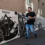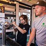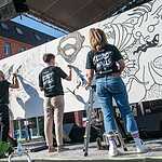 Основная сцена. На сцене рисуют граффити. Идём вдоль рядов. Старые добрые названия. Волковская пивоварня. New Riga’s Brewery, CRAFT BREW RIOTS. Обязательно подкрепиться и поболтать с ребятами.
