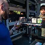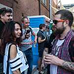 Знакомые ребята из бара Howard Loves Craft. Стоят в стороне, зовут нас. Познакомились на спелеослёте. Ребята устраивали выездной кабак. Здороваемся. Немедленно выпили.