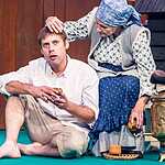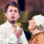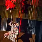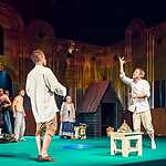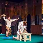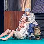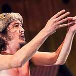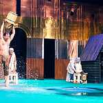 В течение всего спектакля как в пестром хороводе следовали друг за другом русский народ в лице двух мужиков и девицы с ярмарочным шестом, поэты, переходящие от водных процедур к литературному творчеству и обратно, неразлучные с ними верные нянюшка и матушка, изредка возникающая Екатерина II в сопровождении Храповицкого, ни к селу ни к городу хор с частушками и заслуженный артист РФ и Украины Александр Цилинко с арией царя Бориса из оперы Модеста Мусоргского “Борис Годунов”. Как мозаика, сложенная из разноцветных стеклышек, так не подходящих друг другу по отдельности, но таких незаменимых в общей картине, таких гармоничных вместе, складывался спектакль “Цари”. Александр Сергеевич и Сергей Александрович медленно сходились к барьеру поэтической дуэли, держа наготове свои лучшие творения, оба дерзкие, упрямые, гениальные и чем-то очень похожие. Чем закончилась дуэль, не скажу. Это лучше видеть своими глазами.