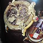 Далее приступили к работе над эмалевым циферблатом. В России это школа Фаберже, честно скажу, кроме наших специалистов, никто подобного не делает. В Швейцарии есть мастер, но к нему очередь расписана на годы, да и стоимость совершенно иная, в отличие от наших расценок. Обратите внимание на «Золотую лозу» – она начинается с циферблатной стороны, проходит насквозь всего механизма и сапфировой каплей падает точно в бокал. Бокал изготовил знаменитый стеклодув заграницей, стоил 8 тысяч евро и был привезён на завод под охраной. Всё было отлично, работа близилась к концу, оставалось нанести три микро-подписи на крошечную этикетку. Но случилось непредвиденное…