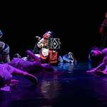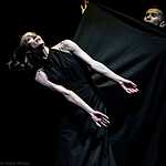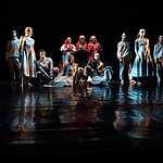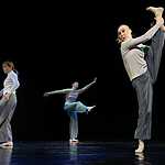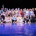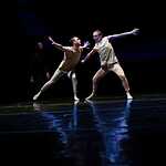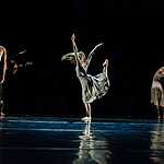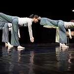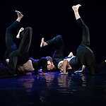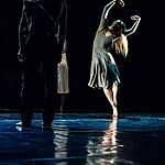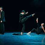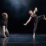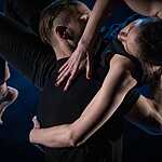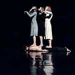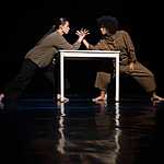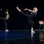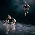 Перед началом танцевальной программы зрителям предложили перформанс — представление, которое происходит в фойе, прямо посреди шума и суеты. Здесь нет ни рампы, отделяющей пространство сцены от зрителей, ни третьего звонка, после которого в зале гаснет свет, и наступает тишина. Чтобы услышать, увидеть, вникнуть в происходящее, надо очень постараться. В этих непростых условиях перформеры показали отрывок из спектакля «Память рода», как мы приходим в этот мир, живем и уходим, становясь частью бесконечной цепочки возрождения жизни. Еще один этюд «Тело слова» продемонстрировал, как пластический танец может рождаться из стихотворного ритма.