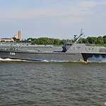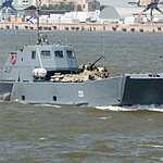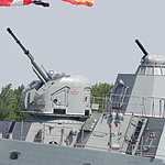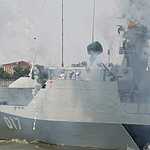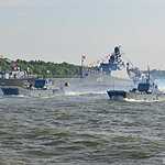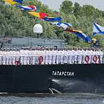 В кильватерном строю показаны артиллерийские, ракетные и пограничные корабли разных проектов. Первый в парадном строю ракетный катер «Ступинец», предназначенный для отражения атак низко летящих средств и уничтожения боевых кораблей, а также транспортных судов противника.