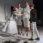 Монопьеса Сергея Давыдова – это пронзительный монолог подростка Коли Мельникова, вопль отчаянья. Юлиана Лайкова сотворила из монопьесы полноценный спектакль со множеством персонажей. Это не реальные люди, а образы, запечатленные в голове главного героя. Его черно-белый внутренний мир населен выхолощенными пустыми бездушными винтиками системы, которую Коля ненавидит до отвращения. А школа как раз ярчайший образчик, уменьшенная копия государственной системы подавления: «Каждое первое сентября соберут в актовом зале и заливают. Стоят в своих вонючих синтетических блузках и улыбаются крысиными рожами. Суки. Где вы были, когда меня всем классом с лестницы скидывали? Когда мне бошку разбили, а вы такие: «Мельников, опять от тебя одни проблемы». Да это от вас одни проблемы, воспитываете скот, а всех, кто не подчиняется, в кашу перемалываете». Что делать: прикинуться тупым винтиком и встроиться в систему или быть перемолотым?