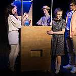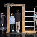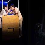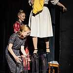 Сцена так же аскетична, как мир Бригитты: швейная машинка, унитаз, который она драит в доме своего будущего мужа, чтобы его родители осознали, какая она хорошая хозяйка, и барная стойка – трансформер, при необходимости выступающая в роли двери, кровати, обеденного стола. Все прочие детали, не имеющие отношения к ее цели, просто удалены. Люди, которым нет места в ее будущем, например, сотрудницы с фабрики, говорят свои реплики и торопливо скрываются за кулисами.