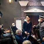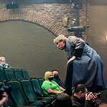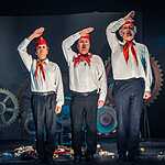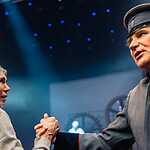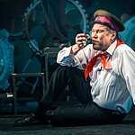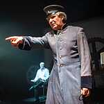 Марк Розовский назвал постановку «Зрелище на троих». Все роли в спектакле исполняют три высококлассных актера: заслуженный артист России Юрий Голубцов, Владимир Давиденко и Валерий Толков. Надеюсь, на меня не обидятся другие участники спектакля, если я признаюсь в любви к Юрию Голубцову. Каждое его появление на сцене это праздник сердца! Первый показ спектакля, думаю, не случайно совпал с днем рождения замечательного артиста. В его исполнении неприятные, даже отвратительные типы превратились в звезд сцены: Нерон, Угрюм-Бурчеев, Верховенский. Сколько тонкой иронии! А Унтера Пришибеева зрители запомнят надолго. По выражению режиссера, этот персонаж как нельзя лучше передает образ современного силовика. И, чтобы дать возможность каждому зрителю поближе, лицом к лицу, пообщаться с представителем силовых структур, Унтер Пришибеев спустился в зал. Это общение вылилось в целое представление с участием зрителей. Юрий Голубцов ходил по спинкам кресел, приставал к зрителям, заставлял их вставать, кланяться, произносить какие-то несуразные слова. Актёр продемонстрировал удивительно тонкую работу с залом, импровизировал, на кого-то ругался, потом дарил баранки. В результате ему не отказал никто, хотя вначале далеко не все были готовы к такому интерактивному театру. Его природное обаяние, в какой бы роли он не выступал, сделало свое дело. Зал включился в игру. Это было очень неожиданно и смешно. Получился настоящий бенефис актера!