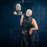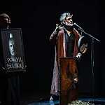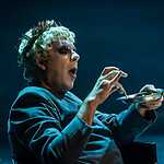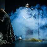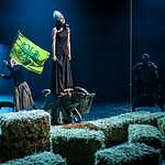 В первой части спектакля на месте императора мы видим то ли шута, то ли сумасшедшего старика, превратившего свою резиденцию в куриную ферму. Действие построено как плавно разгоняющаяся карусель, с каждым оборотом обрастающая новыми персонажами, все более комичными в своей серьезности и бессмысленном следовании этикету. Эпатирующий Зенон, супруга Юлия, играющая роль собственной статуи, страдающая дочь Рея, сроднившаяся с образом Антигоны, министры, не знающие за что хвататься. Они перемещаются по резиденции, постоянно наступая на яйца, и всерьез обсуждают, какой лозунг спасет отечество: «За Бога и рабство!» или «За справедливость, против произвола!». Ромул предлагает более практичный и реальный лозунг «За куроводство и сельское хозяйство!» Кружению масок помогает музыка Фаустаса Латенаса, одного из лучших театральных композиторов, напоминающая то звуки из старинной шкатулки, то срывающаяся в танго. Запускает это бесконечное движение Тит Спурий Мама, гонец, проскакавший 100 часов без отдыха, чтобы сообщить императору о падении Павии под натиском германцев. Он никак не может остановиться. Апогеем его роли становится «ария» усталого гонца, после которой он засыпает, как обессиленный ребенок.