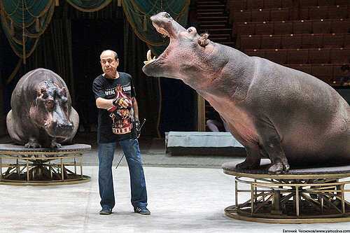Бегемоты – одни из самых сложных для дрессировки животных, но на арене цирка эти тяжеловесные животные проявляют некоторую резвость и даже изящество.