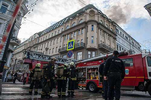Горит крыша Дома книги в Камергерском переулке. Работают пожарные.
