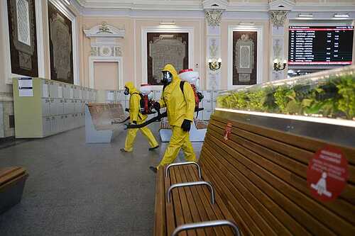 15 мая сотрудники МЧС провели повторную дезинфекцию Курского вокзала.