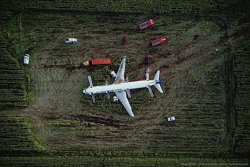 Аварийная посадка самолета в поле из-за столкновения со стаей птиц.