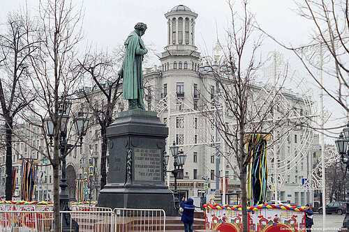 Заключительный эпизод прогулки по Тверскому бульвару начинается возле Театра имени Пушкина и завершается у бронзового памятника поэту.